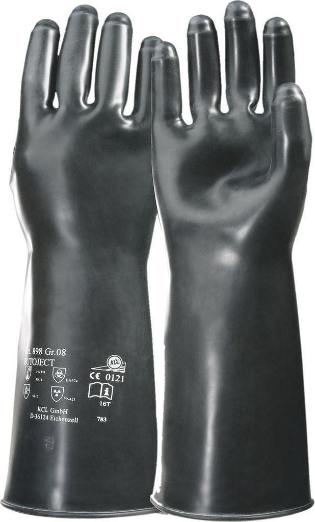 Die Butoject® 898 Chemikalienschutzhandschuhe aus Butyl bieten zuverlässigen Schutz gegen aggressive Chemikalien in hygienisch sensiblen Bereichen. Mit einer Länge von 350 mm schützen sie Hand und Unterarm und eignen sich besonders für Risikoumgebungen in Kliniken, Labors, Reinigungs- und Industrieprozessen. Die glatte Handfläche erleichtert die präzise Handhabung, der Rollrand und das Gepuderteinlagerung sorgen für ein einfaches An- und Ausziehen. CE Cat. III sowie EN 388, EN 374 und EN 421 belegen den hohen Sicherheitsstandard, während die Größen 8–11 und VE: 10 Paar pro Packung flexible Einsatzmöglichkeiten bieten.