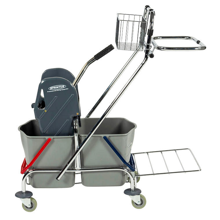 Der Doppelfahreimer Chrom PRO 2 x 17 Liter von Sprintus ist ein professionelles Doppel-Eimersystem auf Rollen. Er dient dem professionellen Reinigungsdienst in gewerblichen Objekten und erleichtert das Auswringen und Transportieren von Schmutzwasser. In hygienekritischen Umgebungen unterstützt er die Sauberkeit in der Gebäudereinigung, in Sanitärbereichen, Waschräumen und Küchenhygiene und hilft Reinigungsteams Kreuzkontaminationen zu vermeiden.