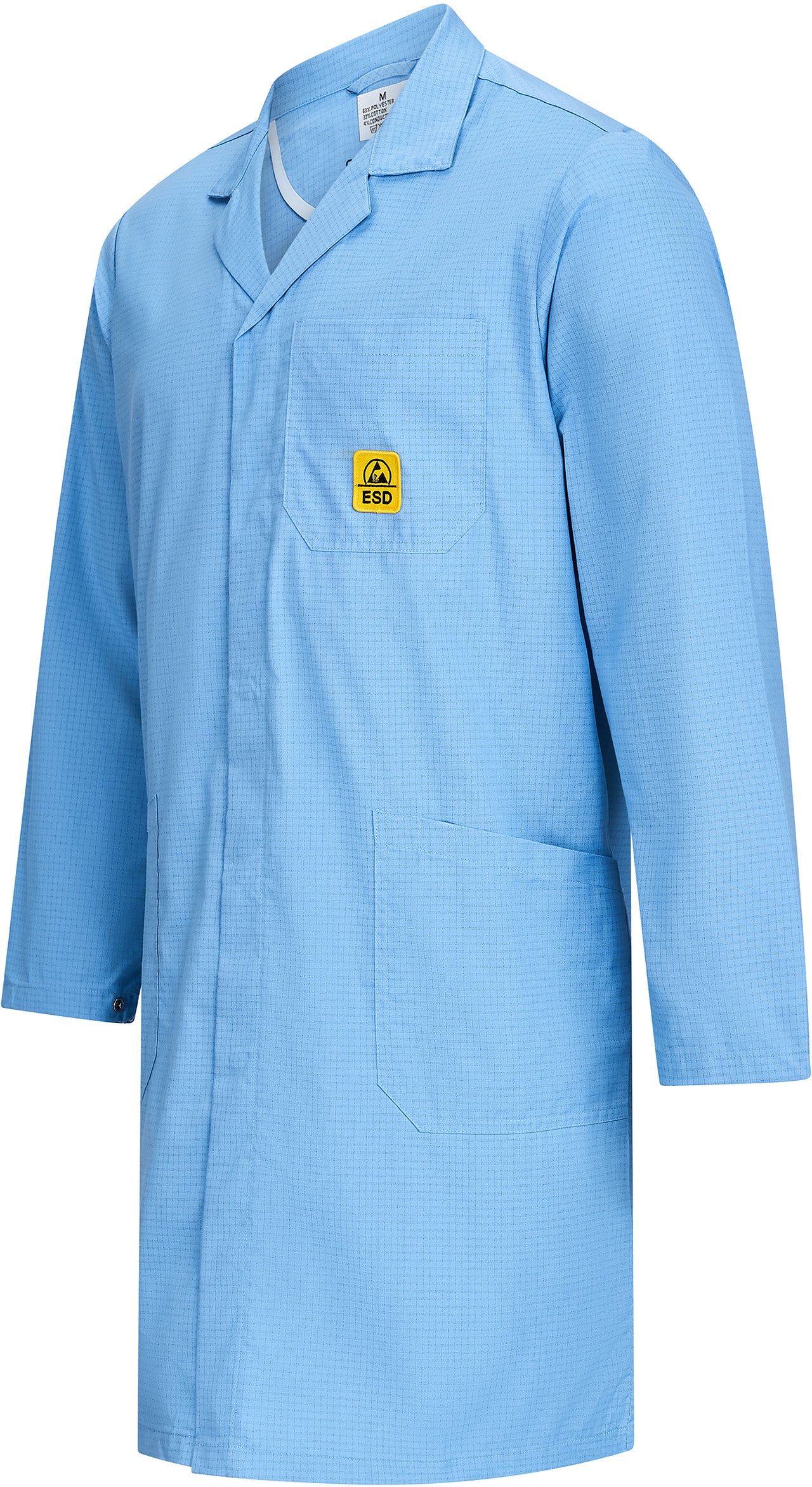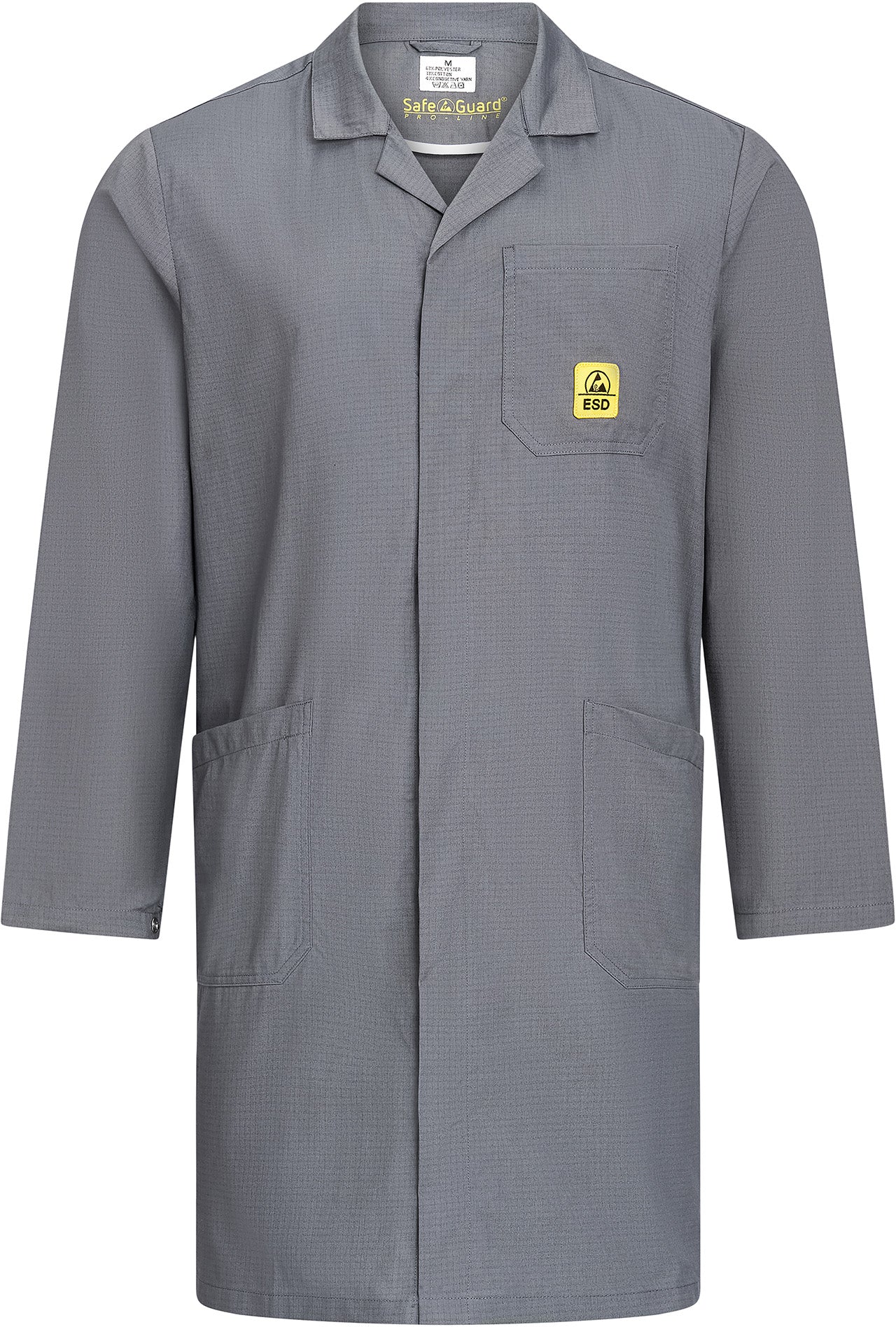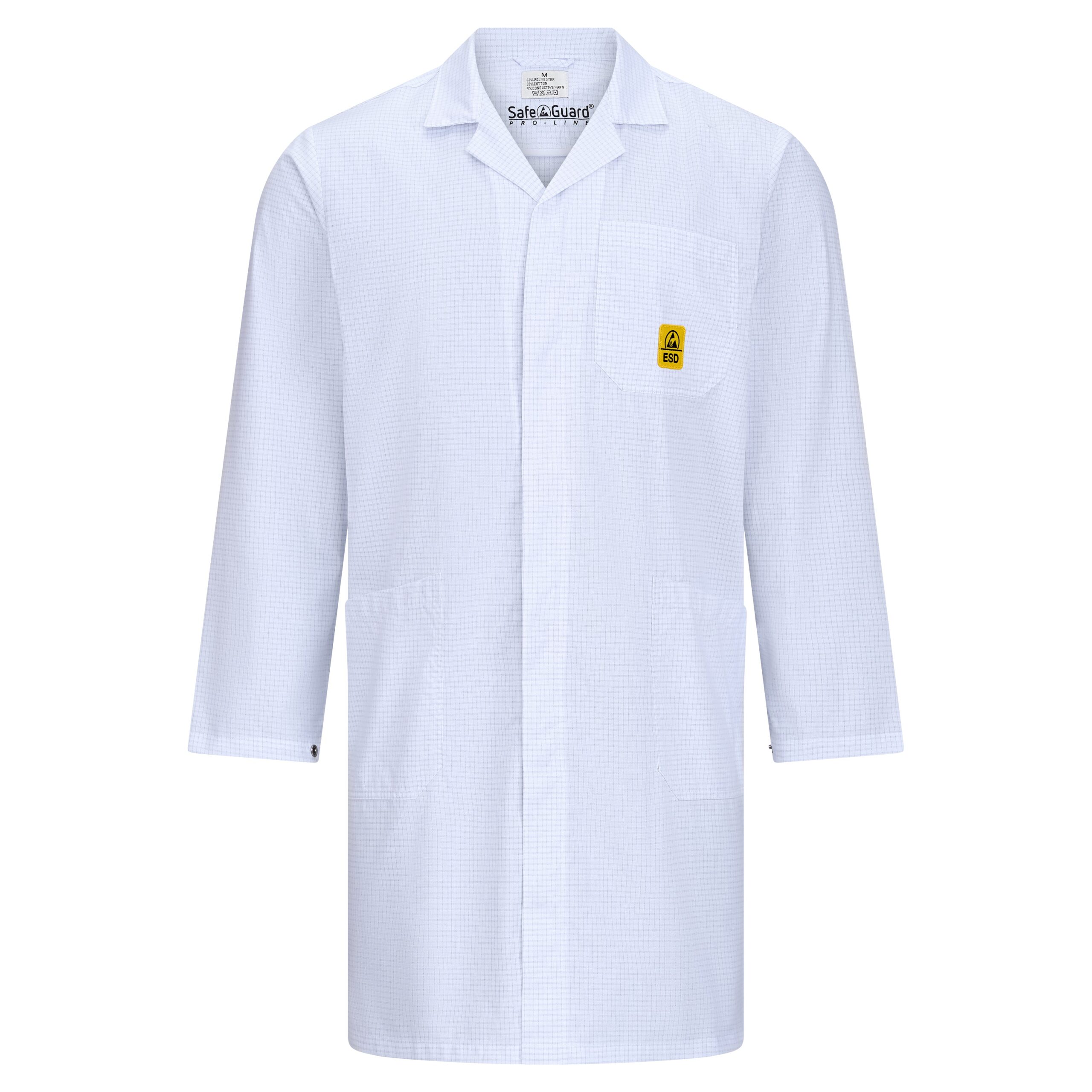 Die 3/4-Konfektionslänge, die abgedeckte Druckknopfleiste und die praktischen Seitentaschen machen den Mantel besonders nutzerfreundlich – ob in Elektronikfertigung, Labor oder Qualitätskontrolle. Er ist unisex tragbar und erfüllt die Anforderungen der DIN EN 61340-5-1 für ESD-Schutzkleidung.