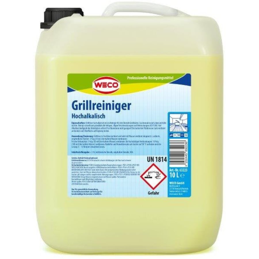 WECO Grillreiniger ist ein hochalkalischer Spezialreiniger zur kraftvollen Entfernung von Fett, Öl und eingebrannten Rückständen. Ideal für Großküchen, Gastronomiebetriebe und die Lebensmittelindustrie – überall dort, wo starke Verschmutzungen auf heißen Oberflächen auftreten.