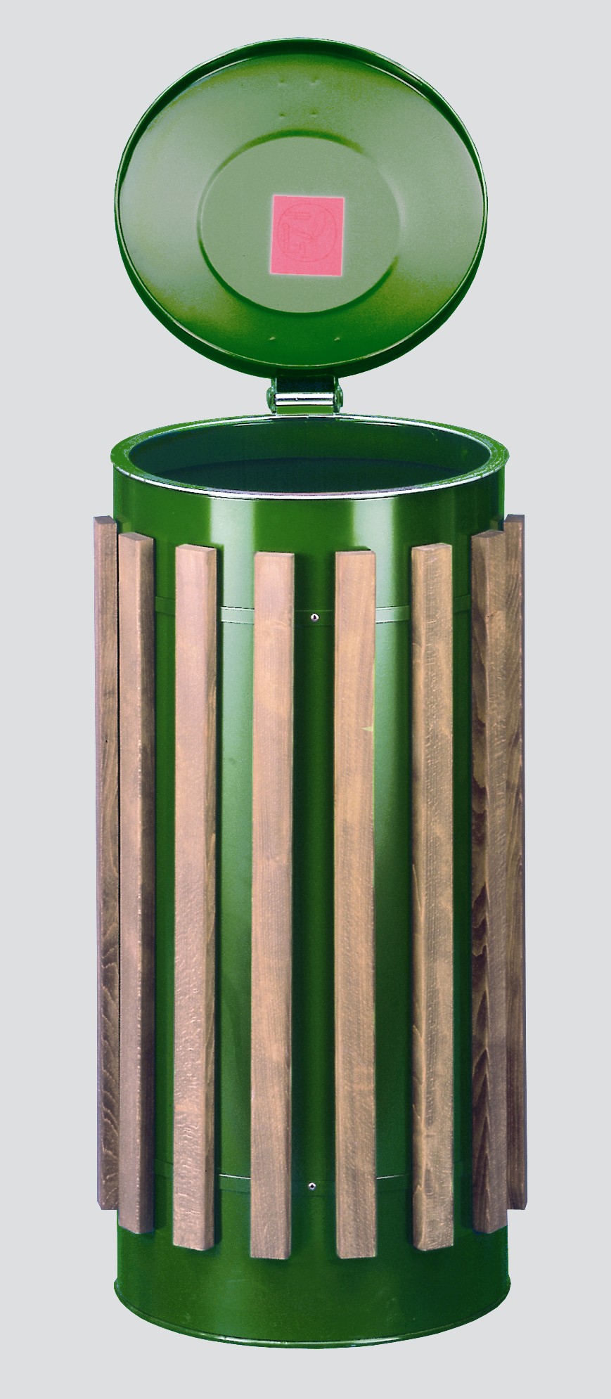 Hochwertiger Outdoor-Abfallsammler für Parks, Raststätten, Fußgängerzonen & kommunale Außenbereiche – kombiniert robusten, elo.-verzinkten Stahl mit wetterfester Holzverkleidung im naturnahen Design.