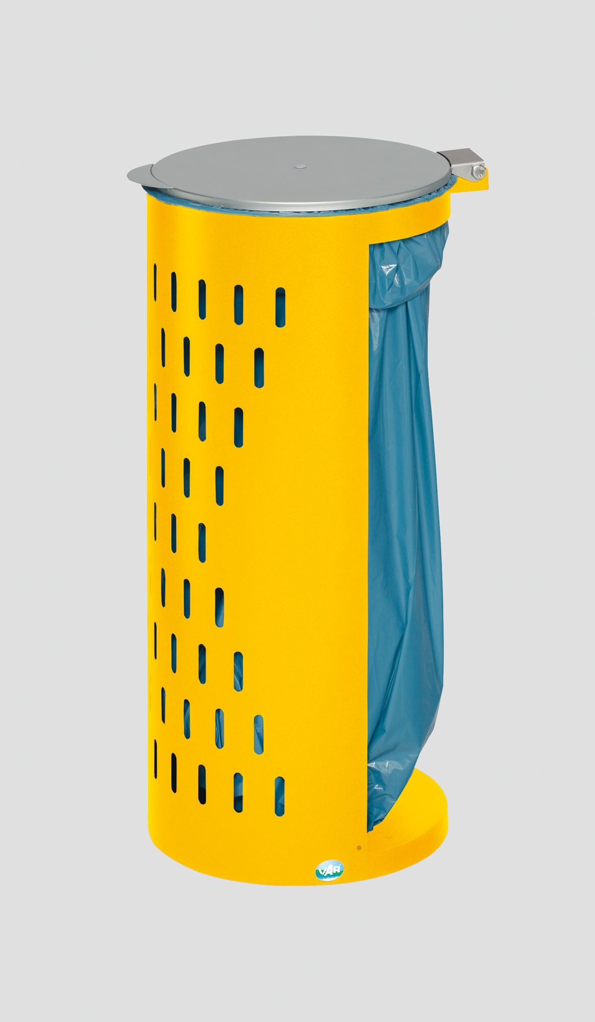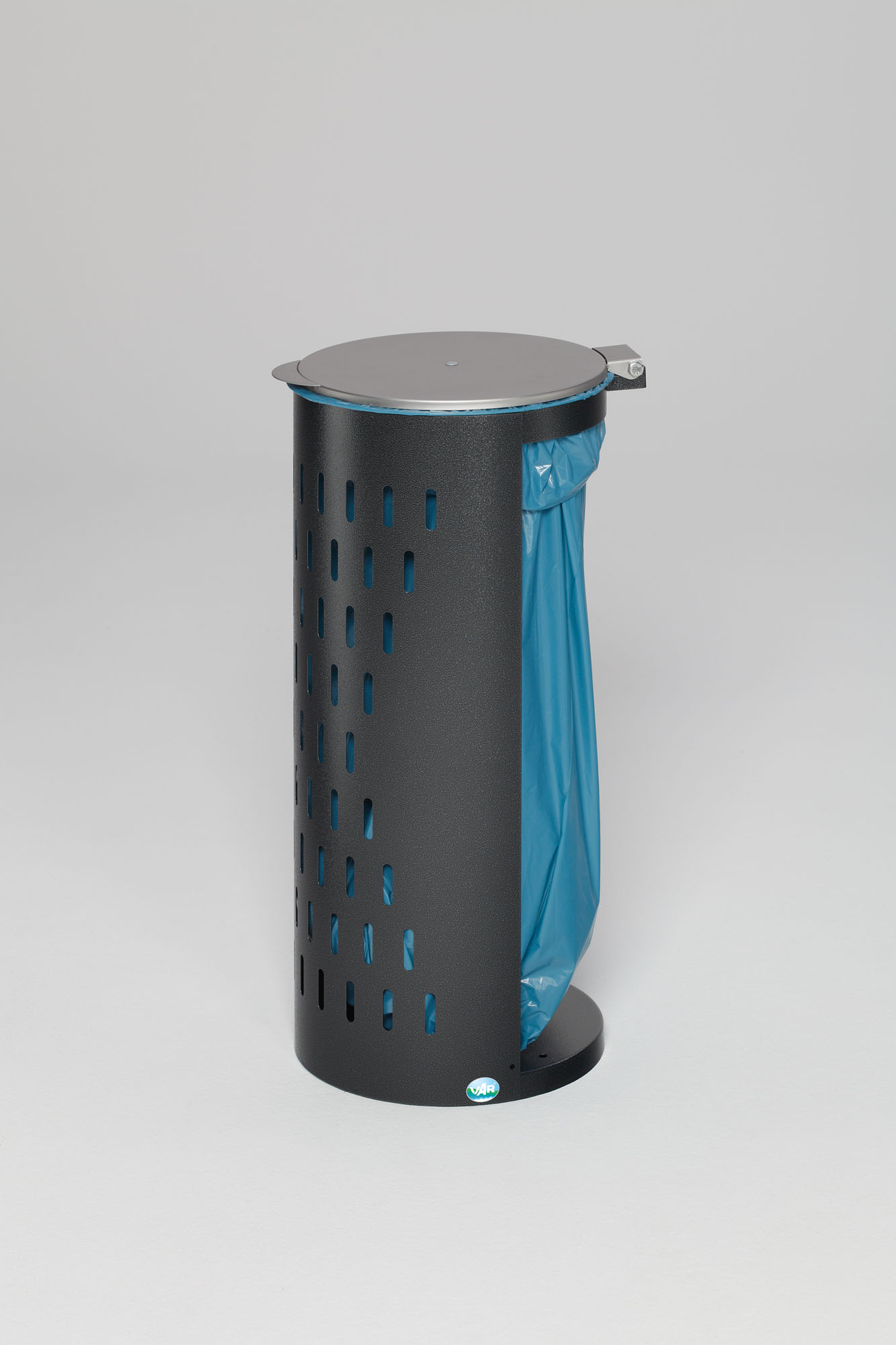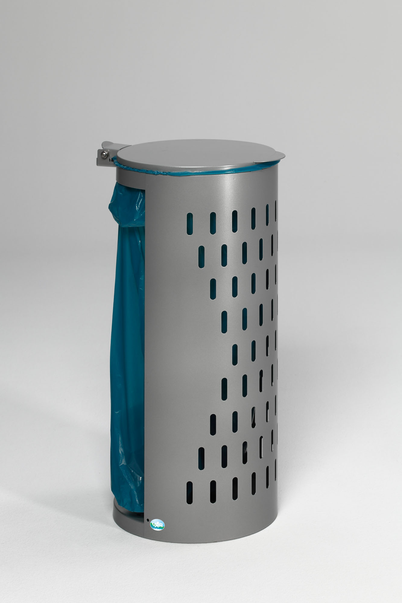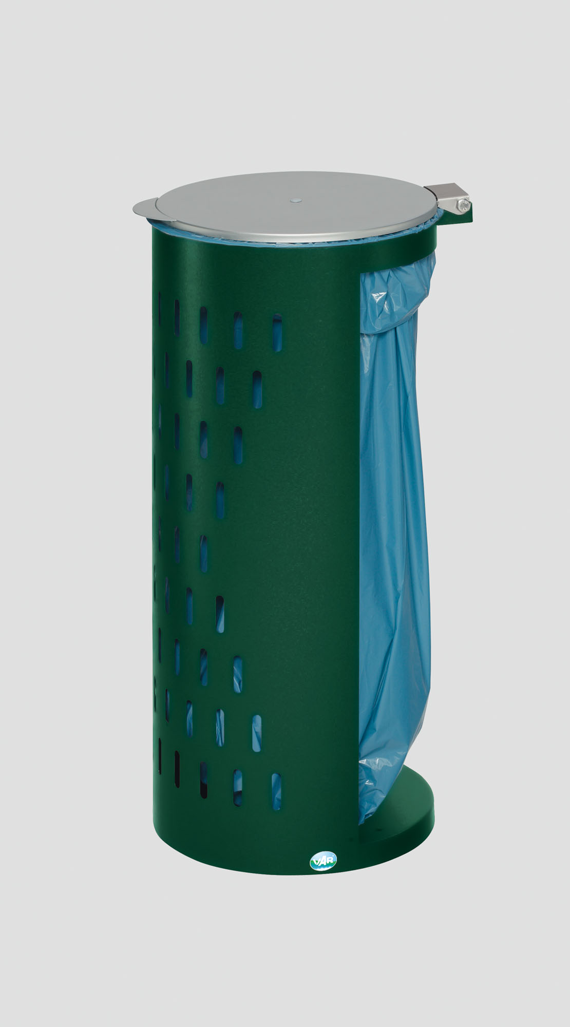Suchbegriffe: Kompakt H85, Lochblech Abfallbehälter 80 L, silberner Metalldeckel, wetterfester Müllsammler, Klemmring.