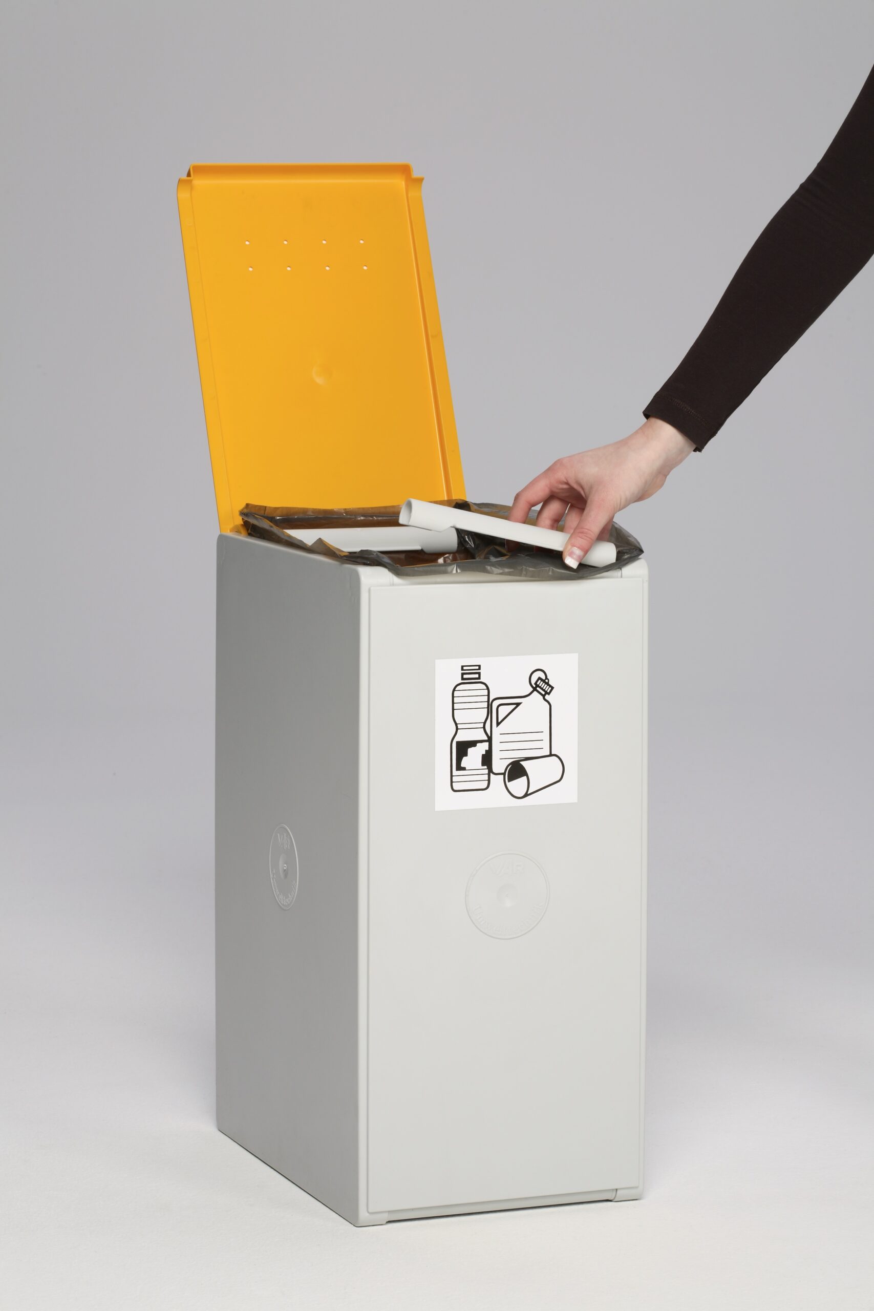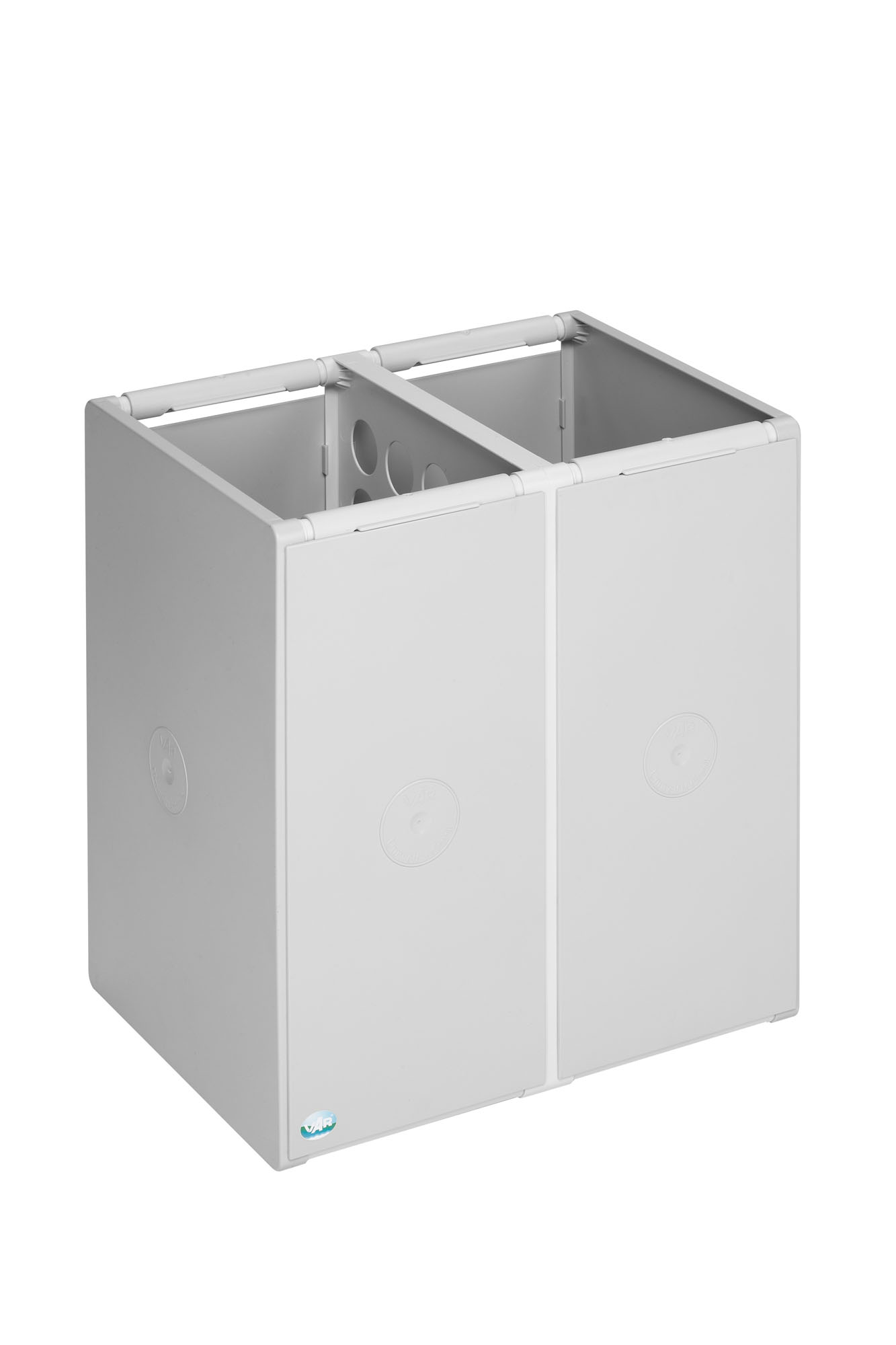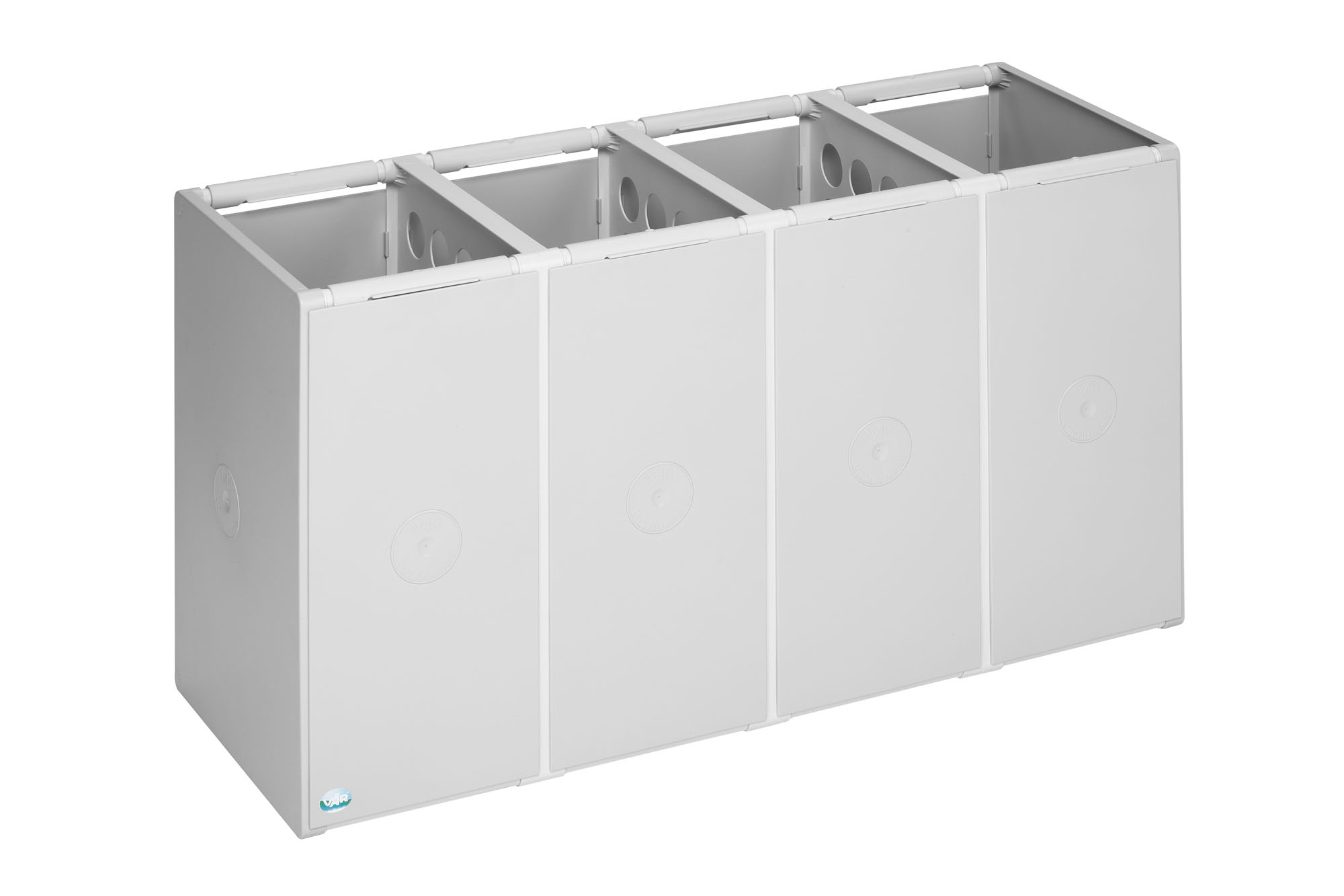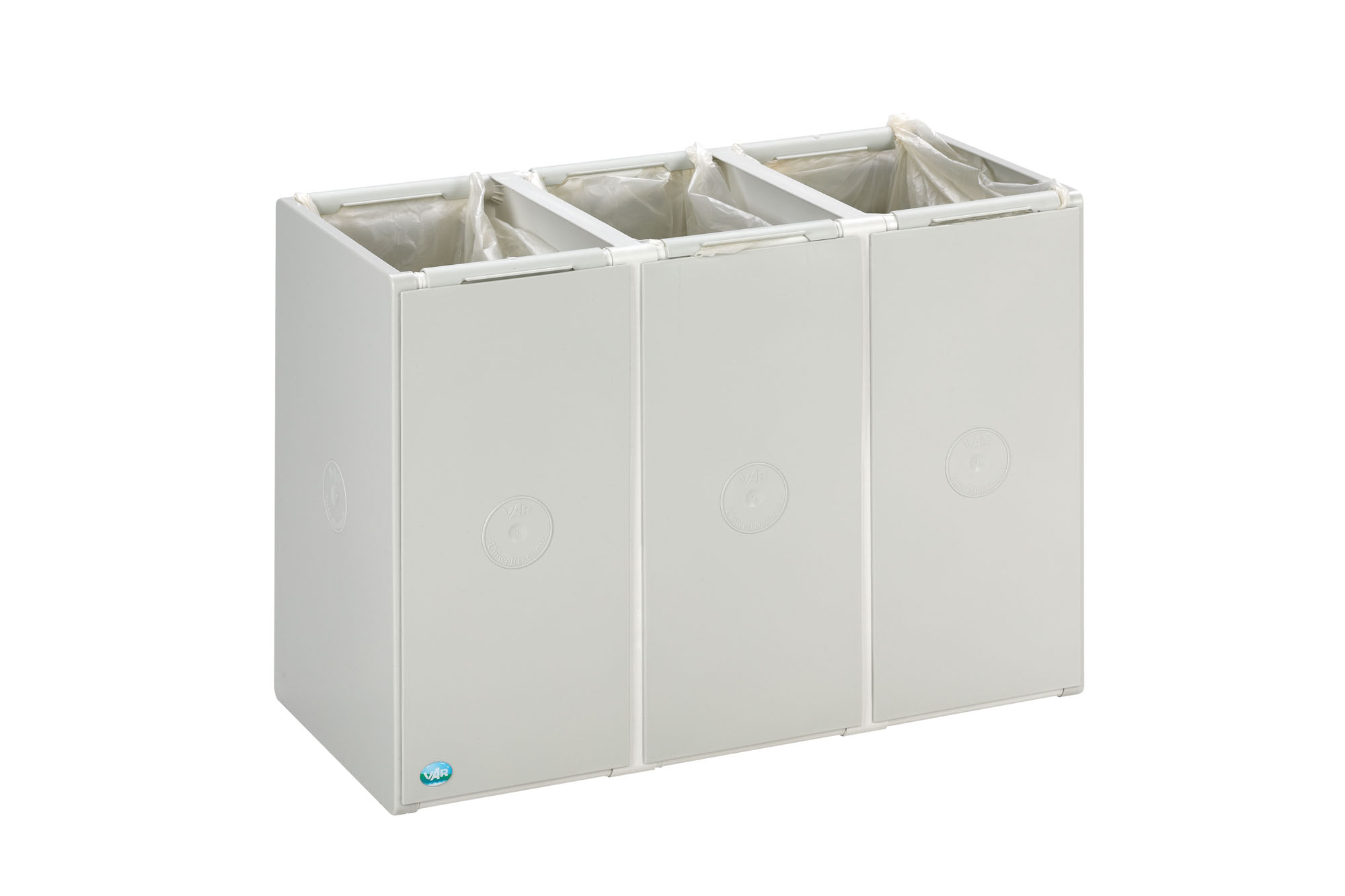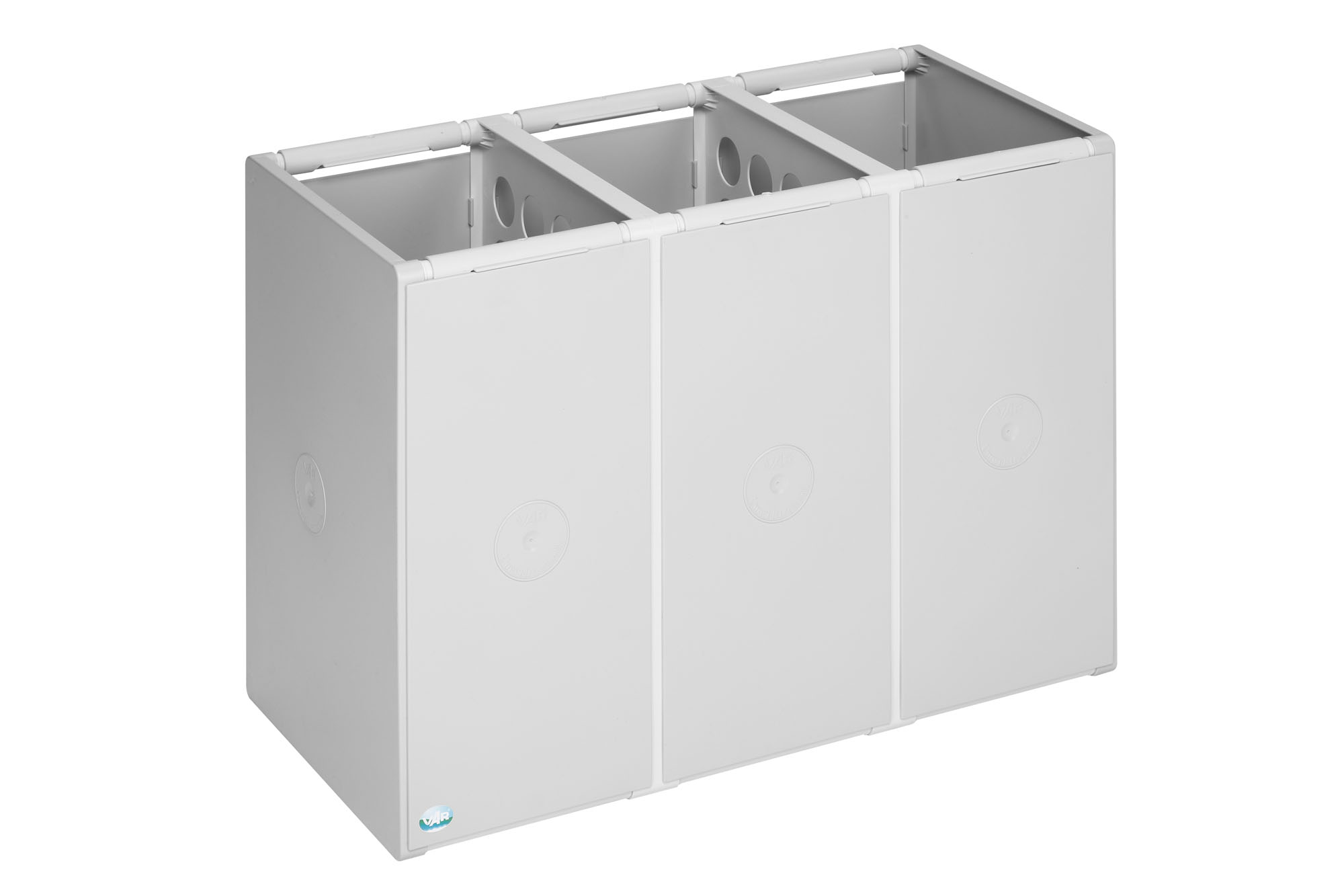 Das modulare VAR Abfall- und Wertstoffsammelsystem aus schlagzähem Polystyrol ist in 40 L oder 60 L erhältlich und wahlweise als 1-fach oder 2-fach Einheit lieferbar. Korpus in Lichtgrau (RAL 7035), optionale farbige Deckel in sieben RAL-Tönen.