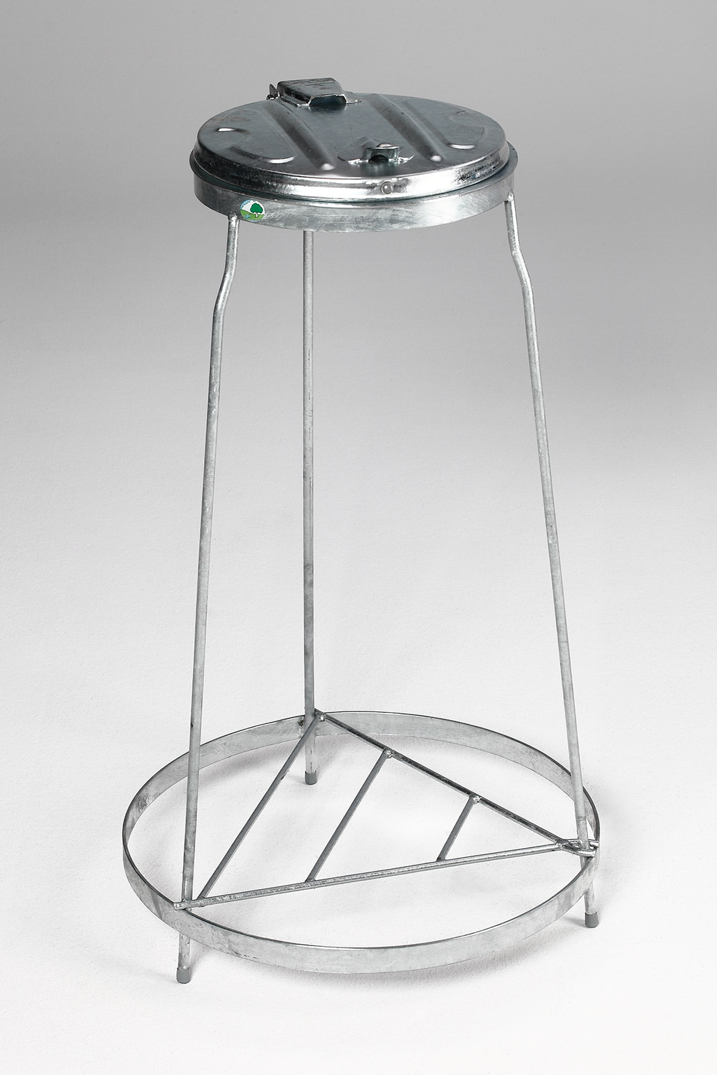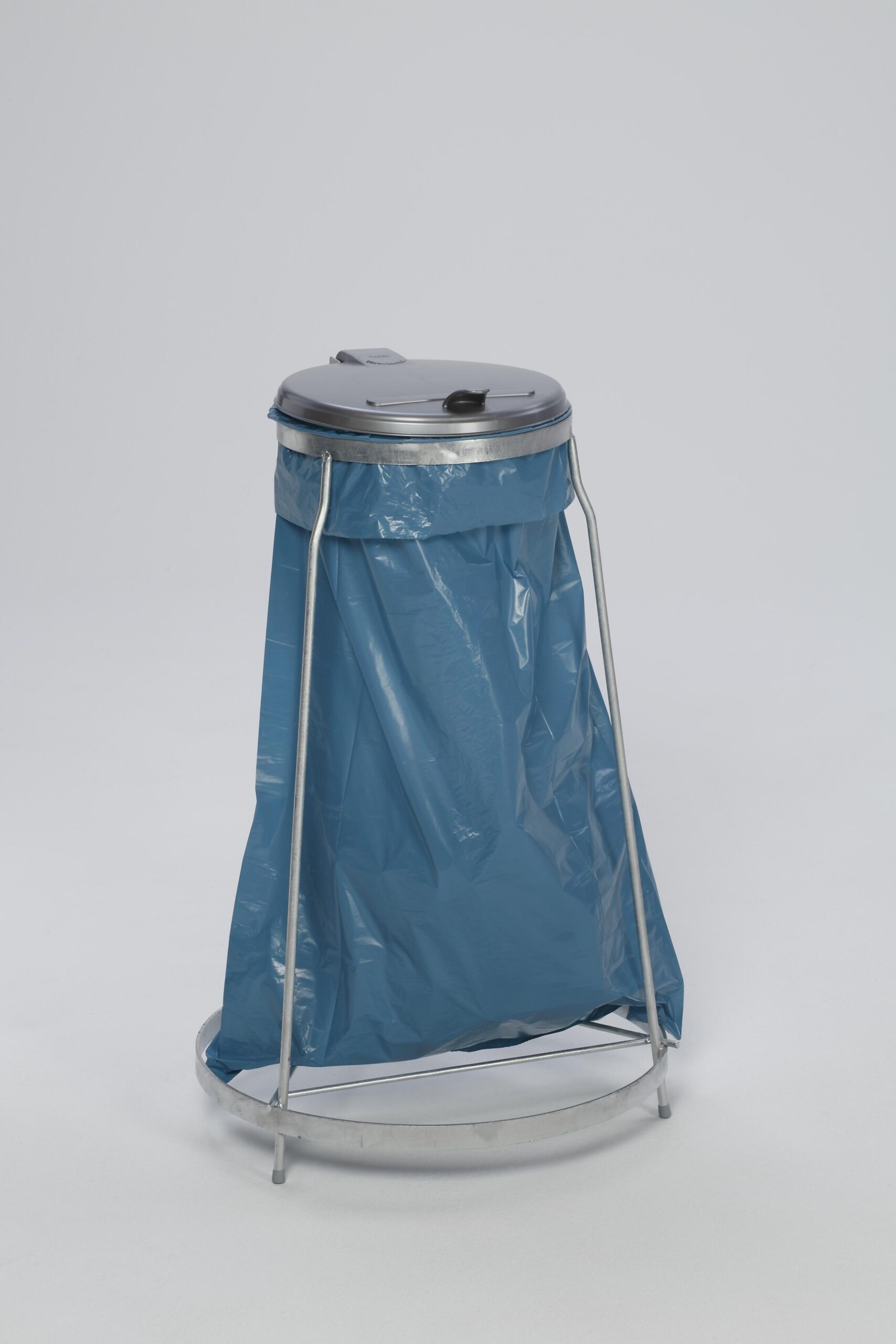 Robuster, feuerverzinkter Stahl-Müllsackständer für 120 L Abfallsäcke. Wahlweise stationär oder fahrbar, mit hygienischem Kunststoff-Klappdeckel in Silber.
