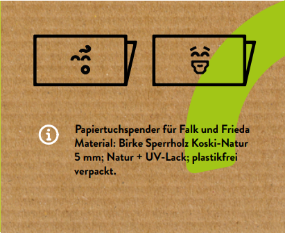Der Handtuchspender ist optimal geeignet für die Falthandtücher FRIEDA und FALK von Green Hygiene®. Diese Papierhandtücher sind bekannt für ihre Umweltfreundlichkeit, hergestellt aus 100% recyceltem Altpapier und zu 100% CO₂-neutralisiert.
