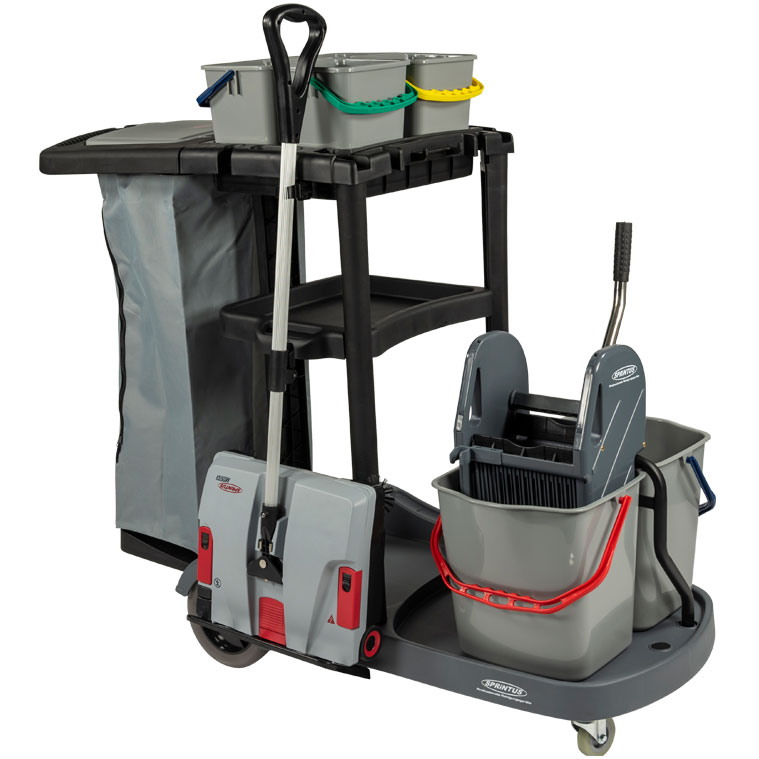 Sprintus PuriX Reinigungswagen komplett Kunststoff | Vier Eimer, 120 L Sack, Mopp-/Besenhalter | Abnehmbare Ablage | für effiziente Grundreinigung in öffentlichen Einrichtungen