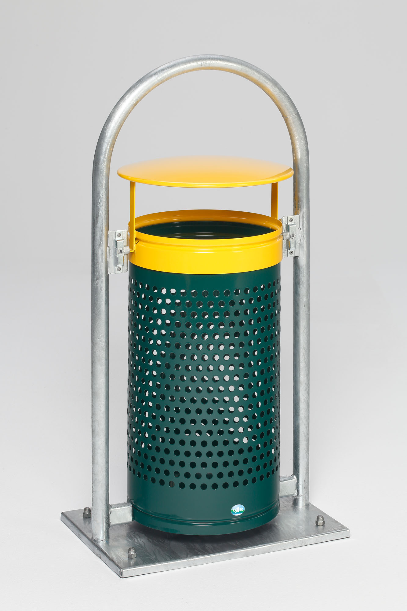 VAR Rohrbogenständer RB 001 | Abfallsammler für Außenbereich | 65-66L | Mit Doppelbartschloss & Inneneinsatz | Varianten: Gelb-Moosgrün, Purpurrot-Purpurrot, Feuerverzinkt