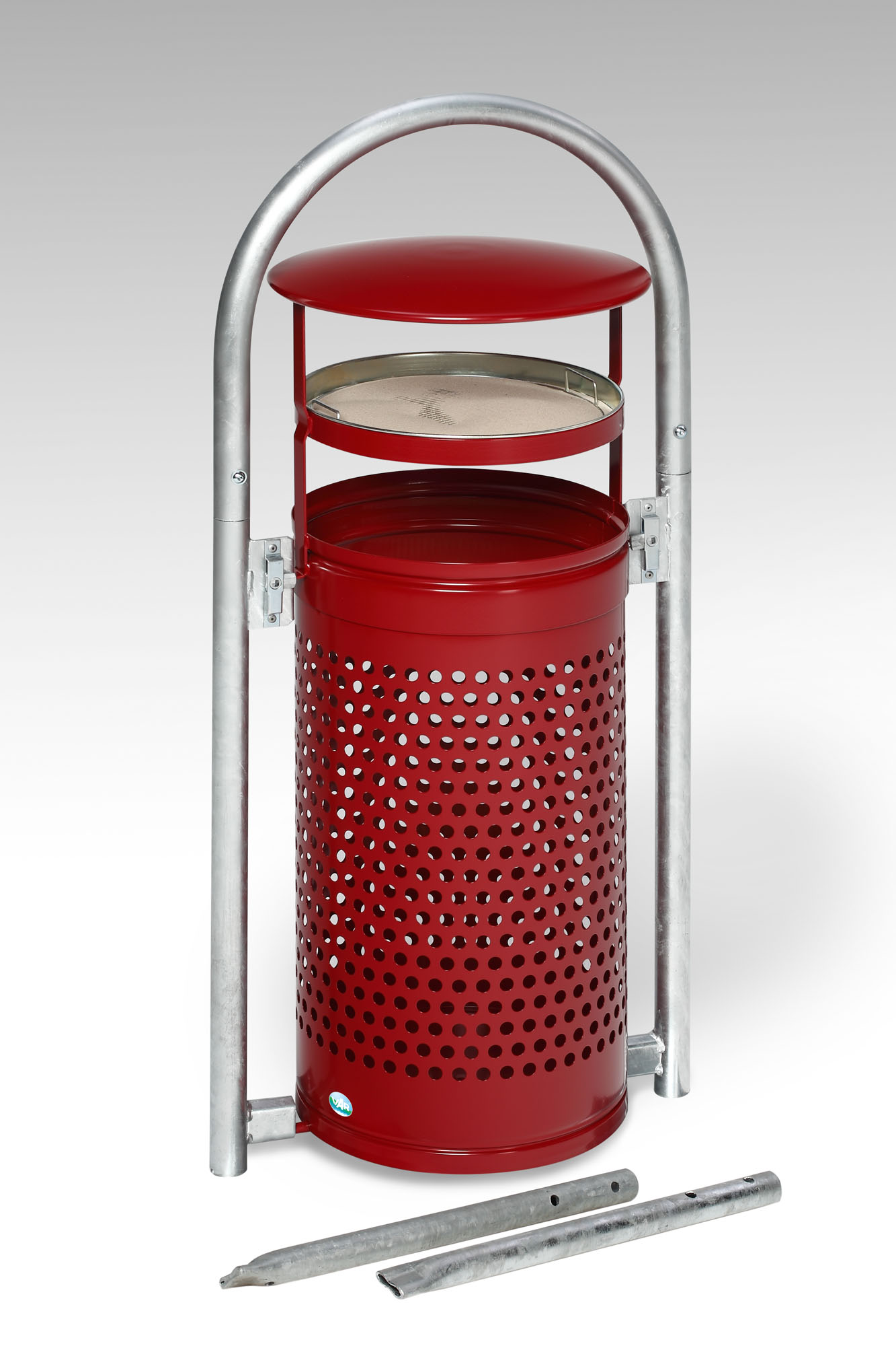 Der VAR Rohrbogenständer RB 002 setzt mit seiner leuchtenden Purpurrot-Beschichtung (RAL 3004) und der robusten Stahlkonstruktion ein deutliches Zeichen für modernes Abfallmanagement im öffentlichen Raum. Durch das pulverbeschichtete Kopfteil und den feuerverzinkten Rohrbogen ist er besonders witterungs- und vandalismusbeständig.