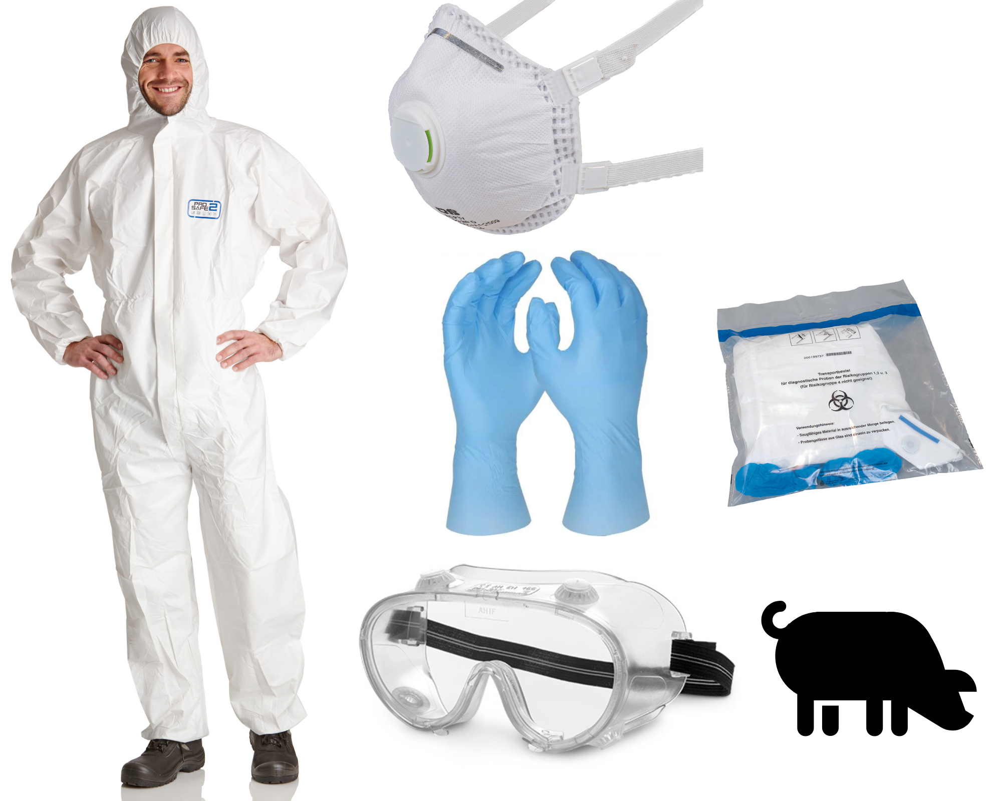 Das Schweinegrippe-Infektionsschutzset BASIC von DS SafetyWear bietet professionellen Schutz in Biosicherheitsstufen 1 und 2. Es umfasst den robusten ProSafe® 2 Overall (CE Kat. III Typ 5b/6b, antistatisch, EN 14126), eine indirekt belüftete Schutzbrille nach EN 166, eine FFP3-Maske mit Ausatemventil, hochwertige Nitril-Handschuhe mit langer Armstulpe (EN 374, EN 388) sowie selbstklebend verschließbare Entsorgungsbeutel für biologische Stoffe mit Griffzone.