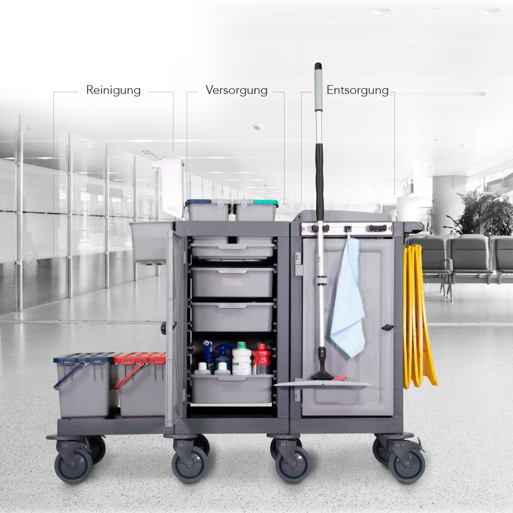 Modulare Bauweise, abschließbare Türen, vier Ausführungen, acht Lenkrollen Ø150 mm, geschlossene Hygieneeinheiten (Eimer/Mopp-Boxen), hohes Ladevolumen