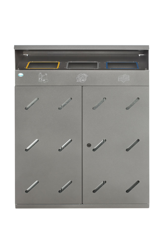 Der Korpus aus verzinktem Stahlblech ist pulverbeschichtet und schützt zuverlässig vor Korrosion, Kratzern und Umwelteinflüssen. Die Wertstoffsammelstation ist mit einem Dreikantschloss ausgestattet, das unbefugtes Öffnen verhindert und somit für Sicherheit und Ordnung sorgt. Die herausnehmbaren Innenbehälter erleichtern die Wartung und Entleerung.