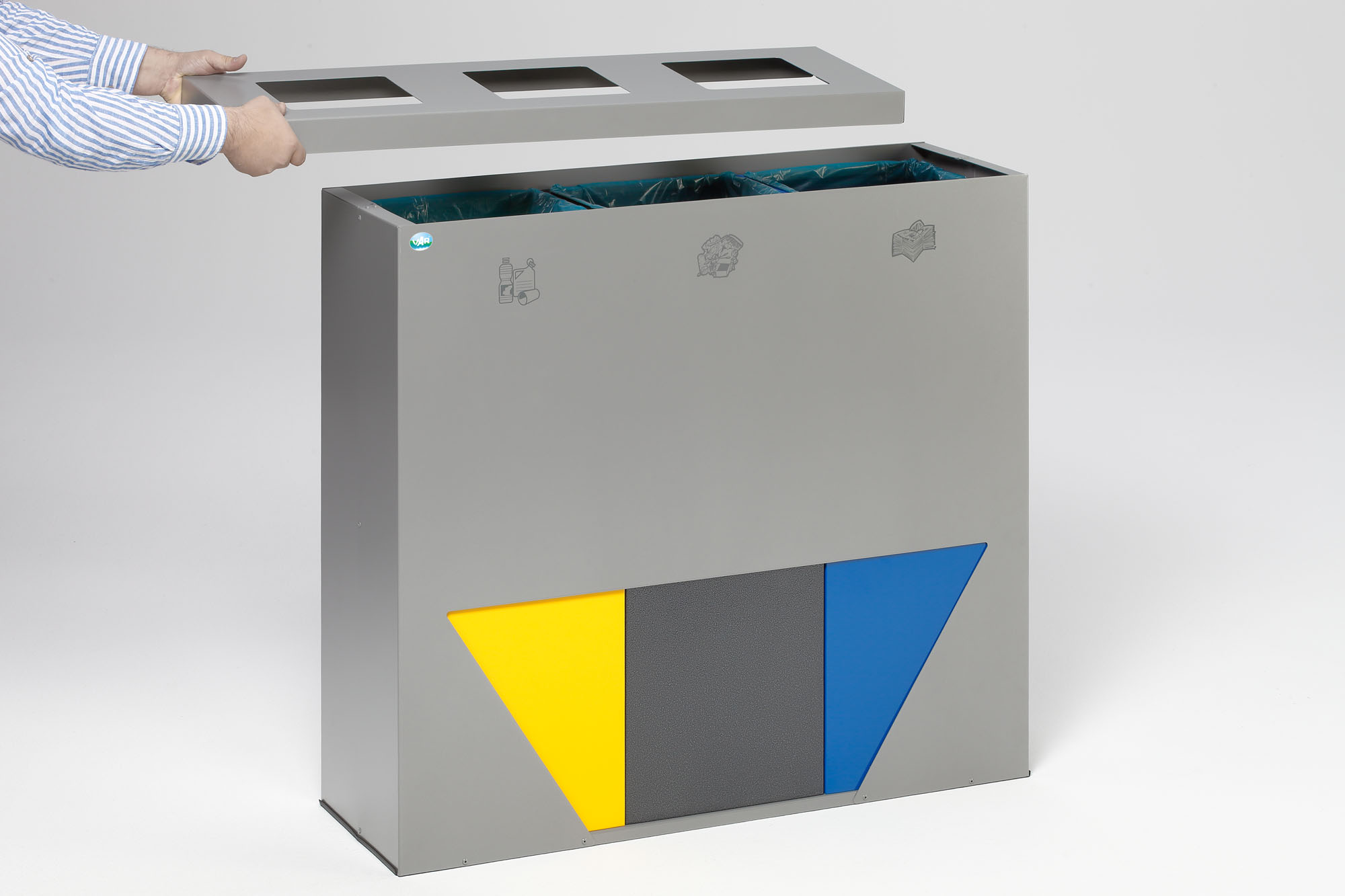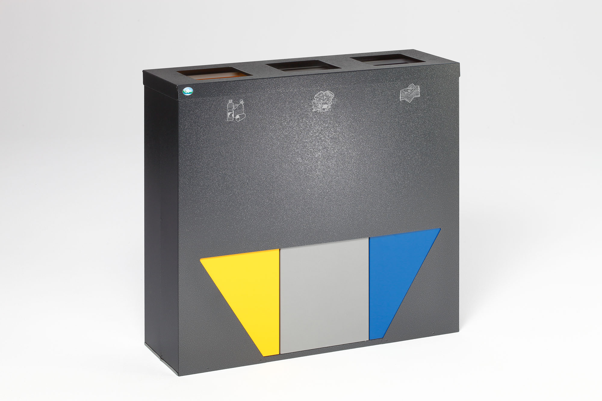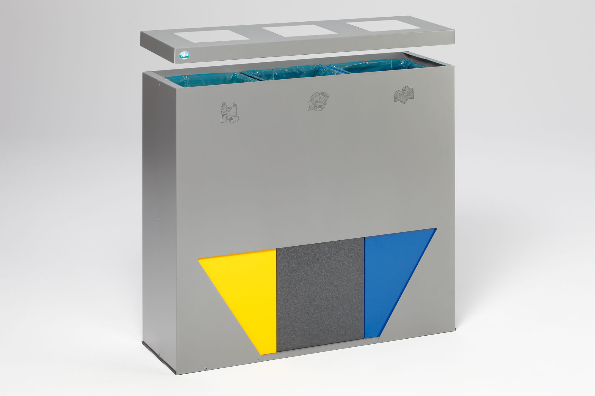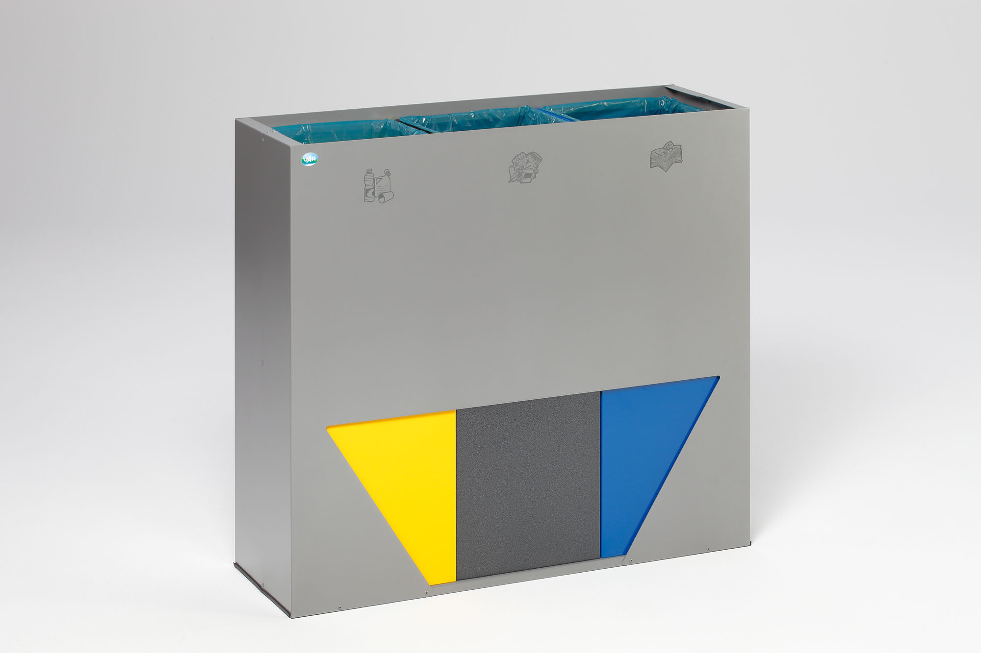 Die VAR WS Trapez 93 ist Ihre professionelle Recycling-Station mit insgesamt 89 Litern Volumen, ausgestattet mit drei herausnehmbaren 29.7 L Einsätzen in Gelb, Blau & Antik-Silber. Das trapezförmige Gehäuse aus elektrolytisch verzinktem Stahlblech ist silber pulverbeschichtet – robust, korrosionsbeständig und kinderleicht zu reinigen.