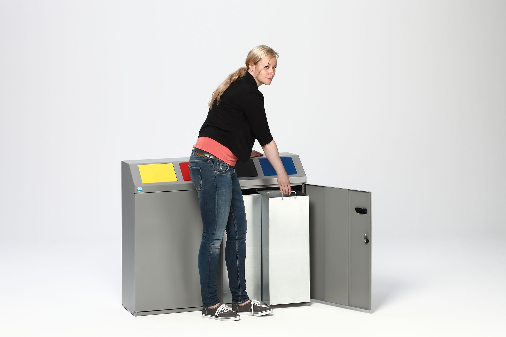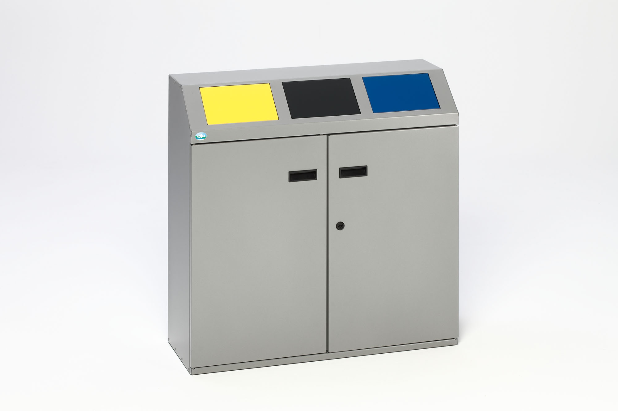 Unser VAR Wertstoffsortiersystem kombiniert höchste Sicherheit und Funktionalität: Aus elektrolytisch verzinkten Stahlteilen gefertigt und mit robuster Polyester-Pulverbeschichtung in Silber versehen, bietet es ein hygienisches, korrosionsbeständiges Trennmöbel für alle Recyclinganforderungen. TÜV/GS-geprüft, mit selbstschließenden Klappen, abschließbarer Front­tür und verstellbaren Füßen – in 2-, 3- oder 4-fach Ausführung von 100 bis 200 Litern Gesamtvolumen.